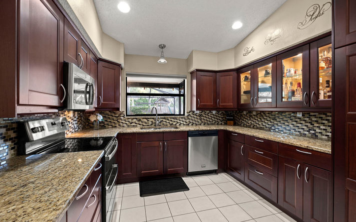 Welcome to Eagles Chase, a serene and well-established community that embodies the laid-back Florida lifestyle. Nestled on a spacious ¼ acre corner lot, this beautifully updated pool home offers privacy with no rear neighbors and a welcoming atmosphere from the moment you arrive. Make your way up the charming walkway leading to the double front door. This 3 bedroom, 2 bathroom, nearly 1,800 square feet of living space home has plenty of room to grow and enjoy for years to come. Entering the foyer, you’ll be greeted by soaring ceilings and abundant natural light streaming through plantation shutters in this open-concept layout. The kitchen is a showstopper, featuring rich dark cherry cabinetry, illuminated glass-front cabinets, granite countertops, a tile backsplash, and newer stainless steel appliances, including a wine fridge. The owner’s suite impresses with wood flooring, a walk-in closet with a custom organization system tucked behind a sliding barn door, and a luxurious ensuite bathroom. The bathroom feels like a spa, offering a large wood vanity with a granite countertop, dual vessel sinks, and an elegant stand-up shower with floor-to-ceiling tile work. The split bedroom layout ensures privacy, with both guest bedrooms spacious and conveniently located near the full guest bathroom. Enjoy the convenience of an indoor laundry room, complete with a utility sink and plenty of storage. Step outside to your private backyard oasis, featuring a spacious screened-in lanai, outdoor stainless steel kitchen, and a 6-foot-deep pool—perfect for hosting BBQs and pool parties. The large, fenced backyard with mature trees provides ample shade and tranquility. Zoned for top-rated Sutherland Elementary School, Eagles Chase is a community that caters to all ages. Golfers will love the proximity to Innisbrook Resort and Golf Club, home of the PGA Tour’s Valspar Championship. With easy access to US-19, commuting is a breeze, and shopping, dining, and entertainment are always within reach. Plus, being close to Lake Tarpon and the Gulf of Mexico allows for endless days of fun on the water—all without the worry of being in a flood zone. Schedule your showing today and don’t let the home of your dreams get away.